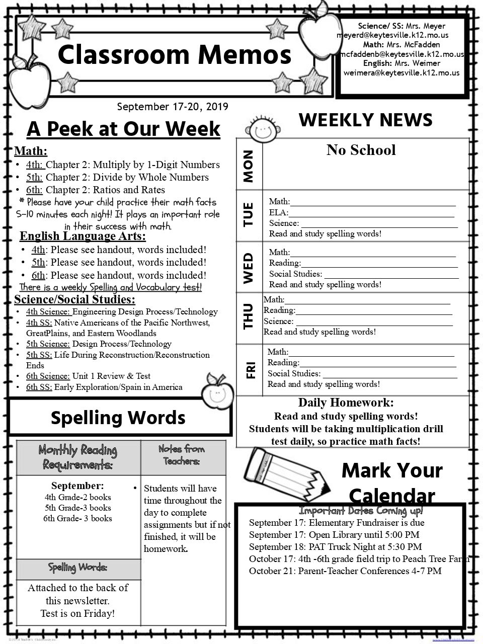 Weekly information, important dates and memos for the week of September 17-20!